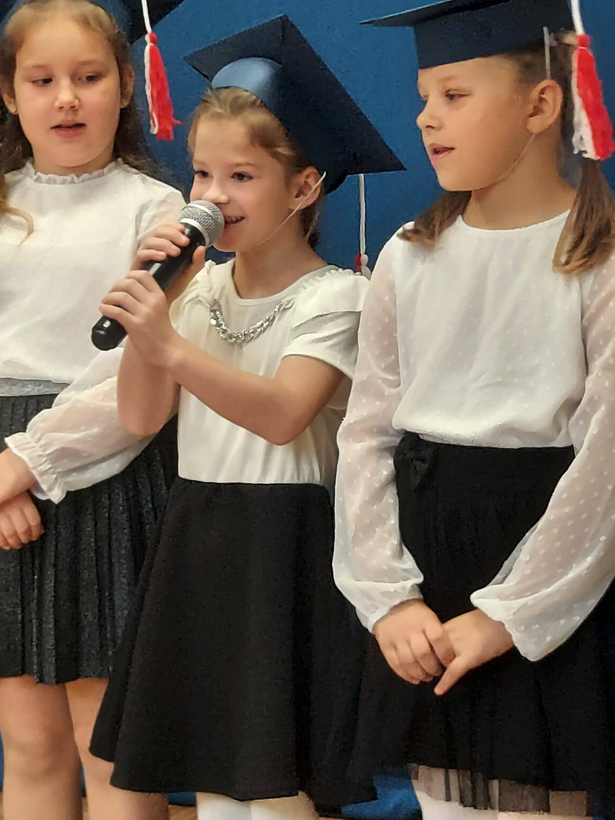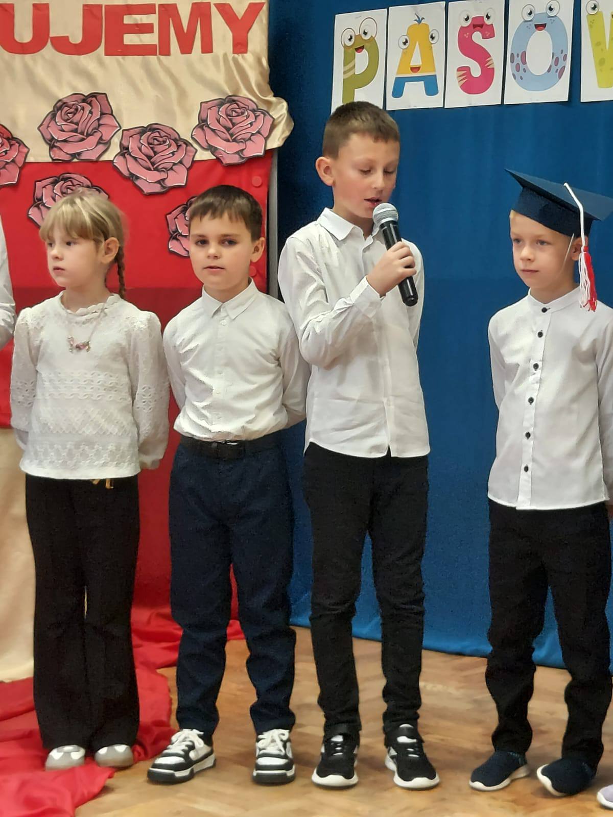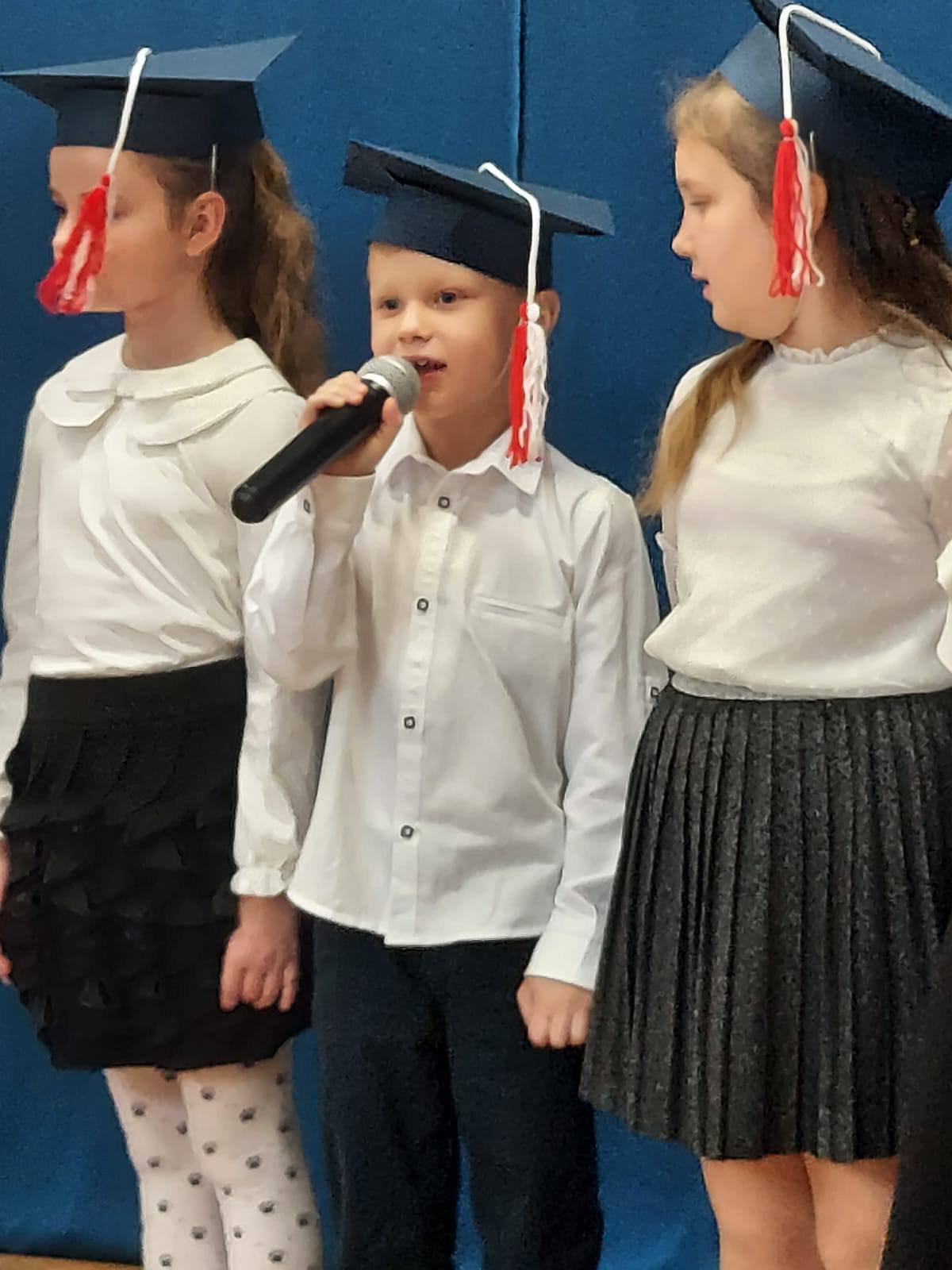 Pan dyrektor Grzegorz Wronkowski powitał gości zgromadzonych na uroczystości: nauczycieli, pracowników szkoły, rodziców oraz uczniów i zaprosił do wspólnego wysłuchania części artystycznej przygotowanej przez p. M. Przyborowską, p. B. Czarnecką, p. U. Góralską, p. Maria Watkowska i p. Marta Rybska